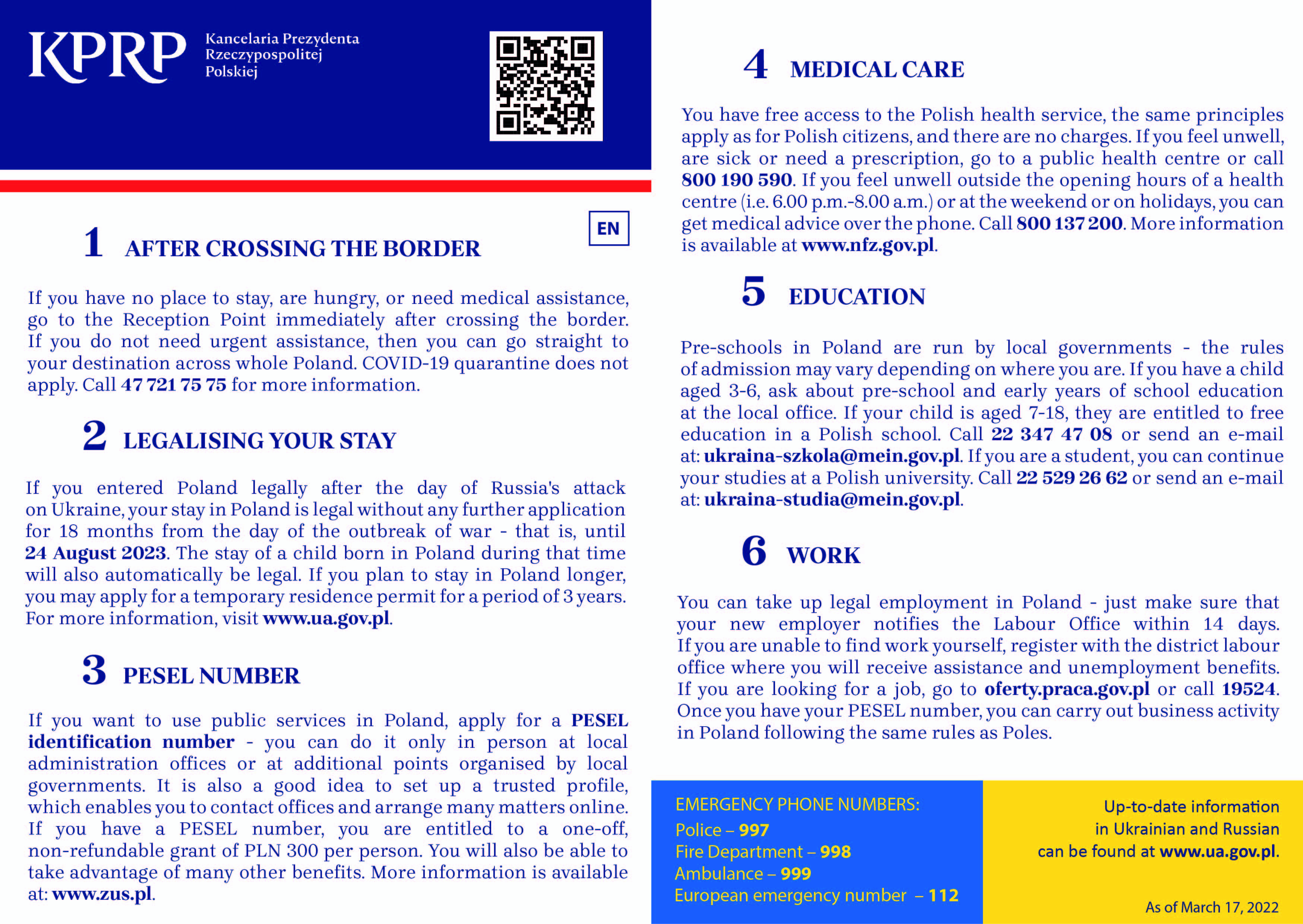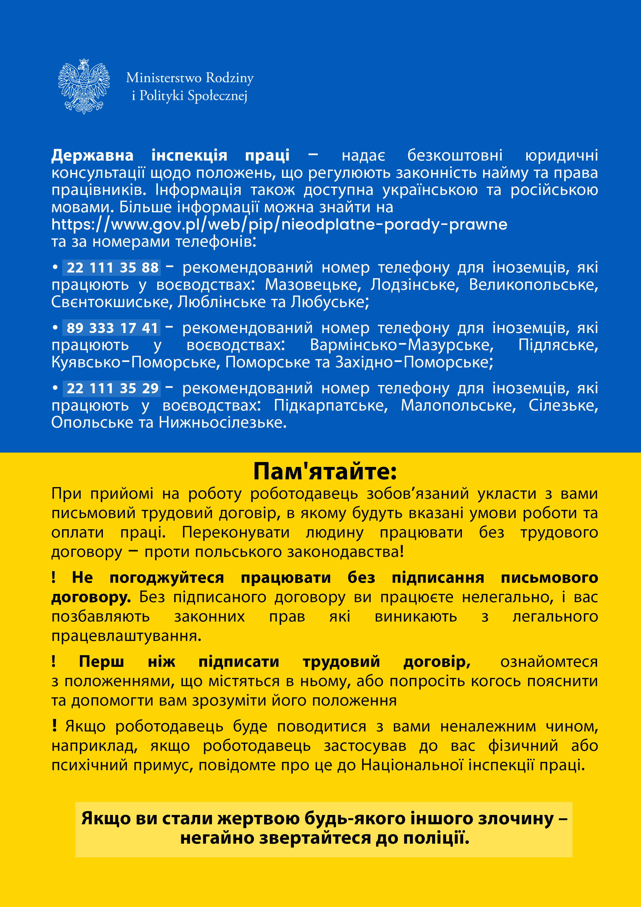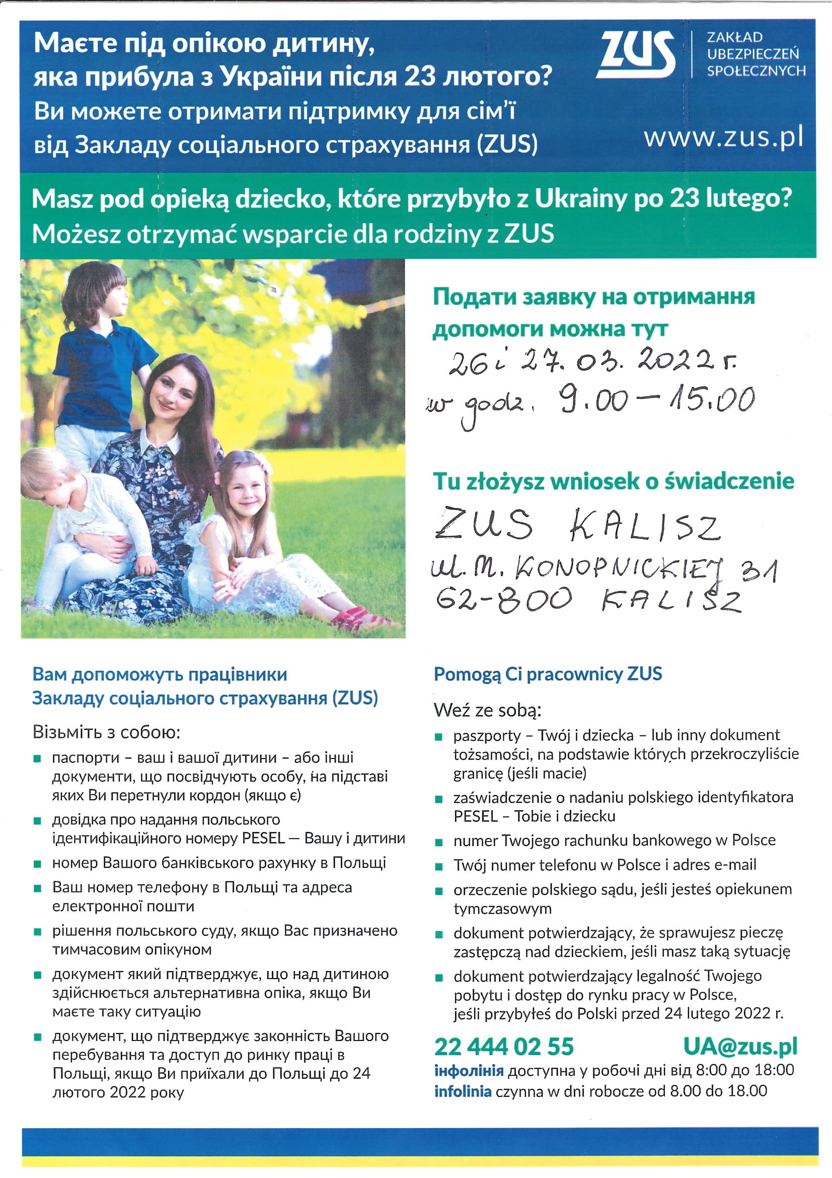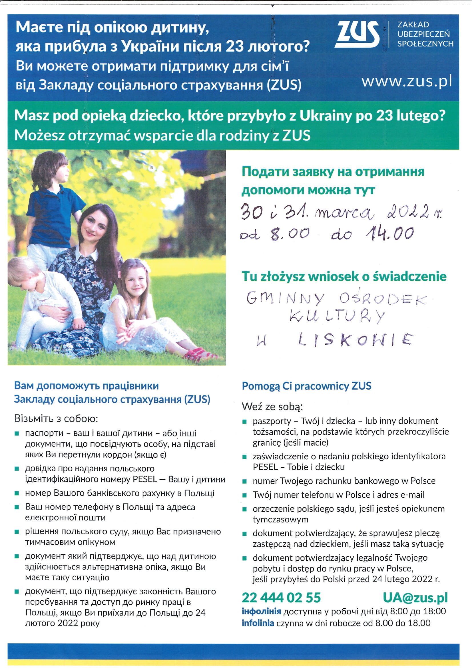 Od 21 marca ZUS uruchomił specjalną linię telefoniczną w języku ukraińskim i polskim w sprawie świadczeń rodzinnych dla obywateli Ukrainy, którzy przybyli do Polski po 23 lutego 2022 r. w wyniku konfliktu zbrojnego.